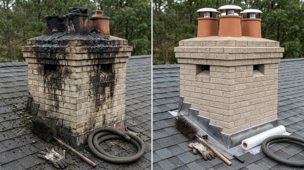 Industrial brushes and vacuum systems remove soot and creosote safety.